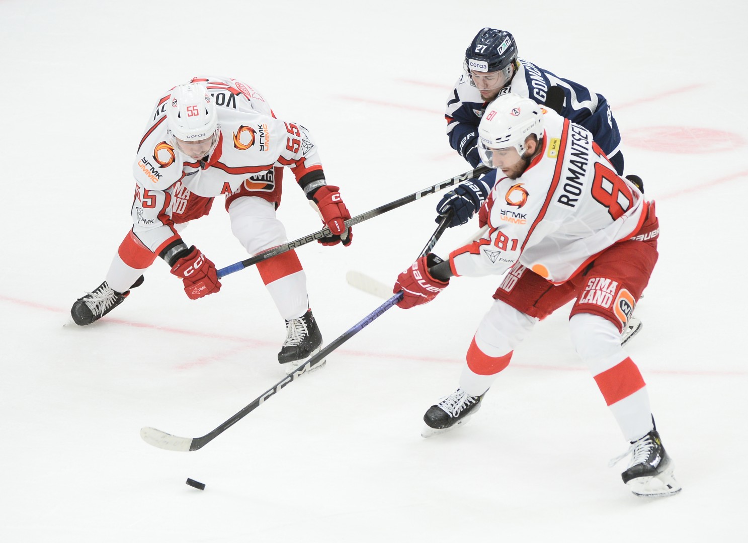 «Автомобилист»: Галкин (Аликин); Трямкин - Эберт, Обидин - Бывальцев - Меркли; Журавлёв - Блэкер, Хрипунов - Да Коста - Голышев; Воробьев - Зборовский, Лайпсик - Волк - Мэйсек; Карпович, Каштанов - Романцев – Денежкин.